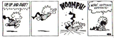 Editado (25/5/2006 20:00): He retocado la entrada siguiendo el consejo de Foe Hammer (leer comentarios), y de paso aprovecho para incluir una tira más: como bien afirma Álvaro Pons, Watterson maneja con talento múltiples registros y referencias. Y en un día como hoy, qué menos que reflejar su conocimiento de la cultura popular (vicio y subcultura) a través de una de las innumerables tiras en las que quedaba de manifiesto.